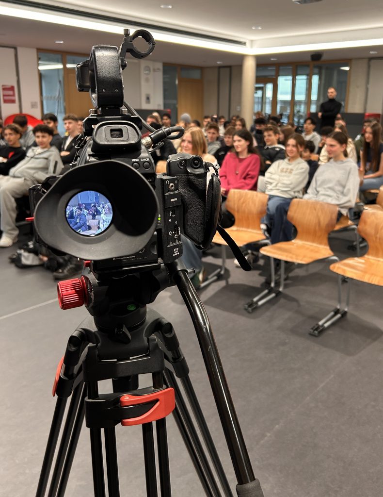 Während der einstündigen Veranstaltung erhielten die Schülerinnen und Schüler einen lebendigen Einblick in die Welt der Film- und Fernsehproduktion. Sie lernten die vielfältigen Aufgaben und Berufsrollen kennen, die bei der Entstehung einer Szene zusammenarbeiten – vom Schauspiel über Kamera und Regie bis hin zum technischen Equipment, das für einen professionellen Dreh unerlässlich ist.