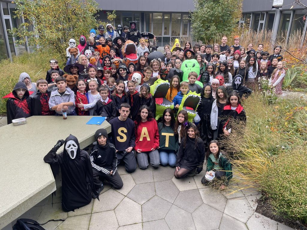 Am Freitag vor den Herbstferien fand die traditionelle Halloweenaktion der SMV statt. Alle Schülerinnen und Schüler, die verkleidet kamen, erhielten in der Aula eine prickelnde Überraschung. Außerdem sorgte die SMV mit Musik und Halloweendekoration schon vor dem Unterricht für ein wenig Gruselstimmung. In der 1. Pause trafen wir uns dann zum gemeinsamen Gruppenfoto.