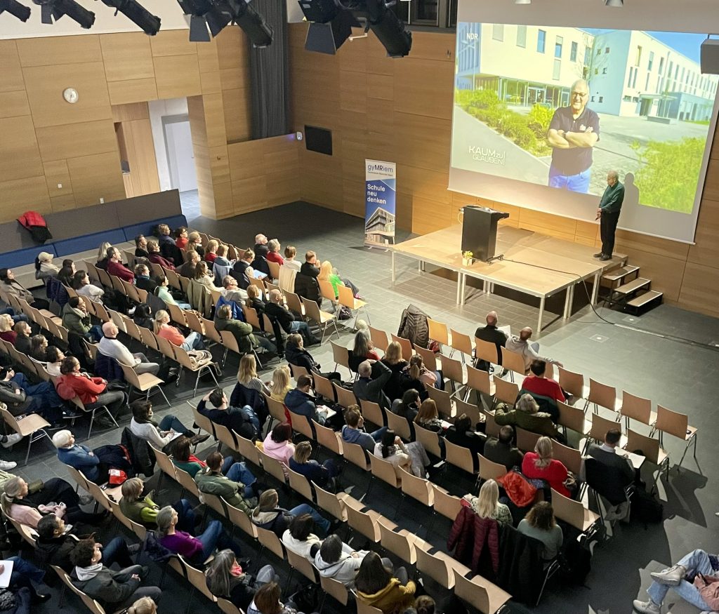Dank der Unterstützung des Fördervereins konnten wir ihn für einen Vortrag über selbstorganisiertes Lernen und die sogenannte Schmetterlingspädagogik gewinnen. Neben den Eltern des gyMRiem nahmen auch Eltern des Gymnasiums Neu-Freimann sowie Schulleitungen und Lehrkräfte der Elly-Heuss-Realschule und verschiedener weiterer Gymnasien aus München und dem Umland teil.