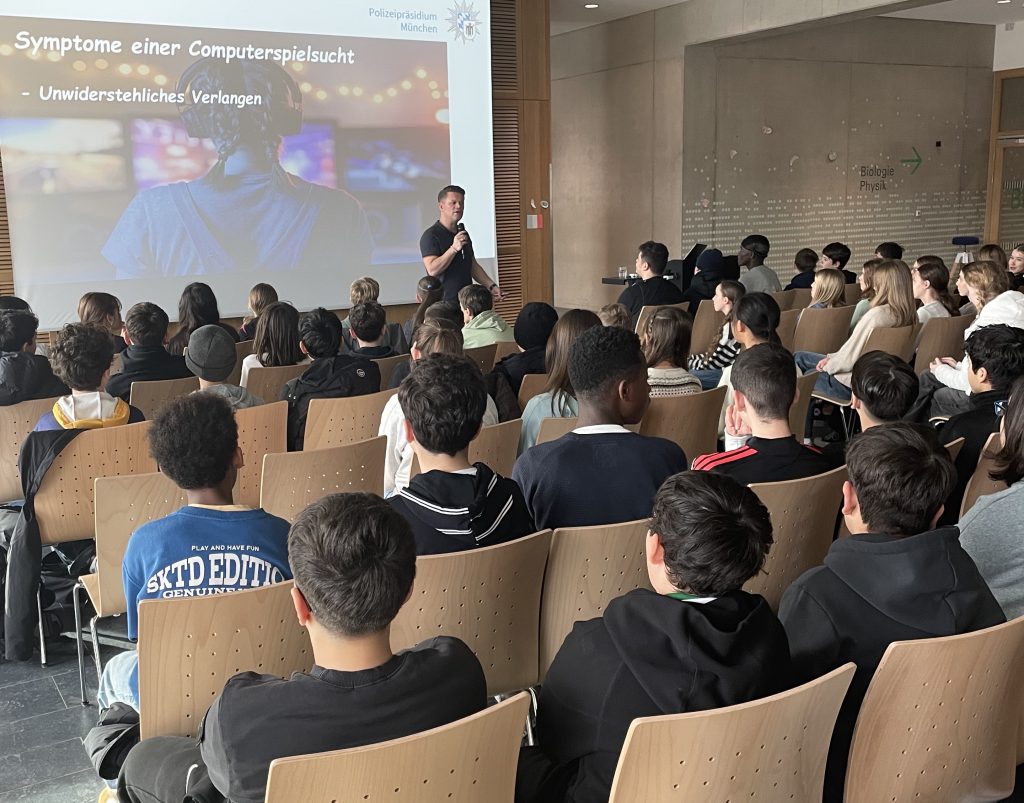 Am 11.02.25 hatten wir Kriminaloberkommissar Martin Ostwinkel vom Kommissariat 105 - Polizeipräsidium München zu Gast. In seinem Vortrag "Neue Medien - Neue Gefahren" wurden unsere 7. Klassen über Gefahren und Risiken im Umgang mit neuen Medien sensibilisiert und über Suchtgefahr, Cybermobbing, Sexting, Cybergrooming, Fragen der Privatsphäre sowie rechtliche Risiken aufgeklärt.