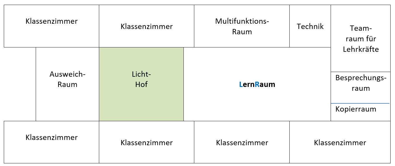 Am gyMRiem sind die Klassenzimmer der Jahrgangsstufen 5 bis 11 in Form von Lernetagen („Lernhäusern“) angeordnet. Um eine zentrale große Fläche herum („LernRaum“) herum gruppieren sich jeweils 6 Klassenzimmer, ein Ausweichraum, ein Multifunktionsraum und einen Teamraum für Lehrkräfte (vgl. Skizze). Der LernRaum ist dabei mit flexiblen und bequemen Sitz- und Arbeitsmöbeln ausgestattet und steht zusätzlich zum Klassenzimmer für offene Unterrichtsformen zur Verfügung.